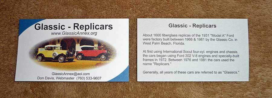 Above: Cards that can be used by owners to give out at car shows. Available from GlassicAnnex